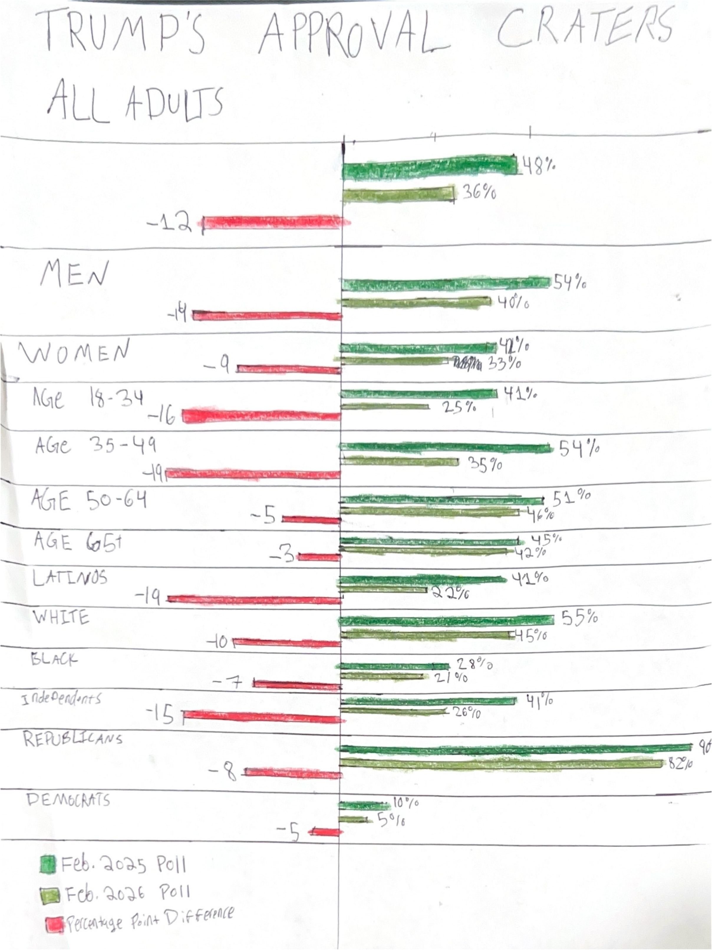 In early March, 2026, CNN published an online article detailing the results of a recent poll done by SSRS research on behalf of the news outlet. In the article, CNN’s Ariel Edwards-Levy created a visualization showing the results of this poll spread across different demographics, in tandem with the same pollster’s work from one year ago, and the resulting difference. I picked this visualization for two main reasons. First, I am a proud recipient of a Bachelor of Arts in Political Science (a degree that really makes you think “Wow, grad school is a sound financial decision relative to trying the job market”), meaning the world of American politics is of inherent interest to me, and this visualization is attempting to communicate an interesting shift in popularity of our current President. The second reason is, I think I can create a genuinely better product that communicates the same ideas from the same data. Why did I think that? Was I successful? Keep reading to find out, but not before looking at the original visualization on CNN’s website linked here.